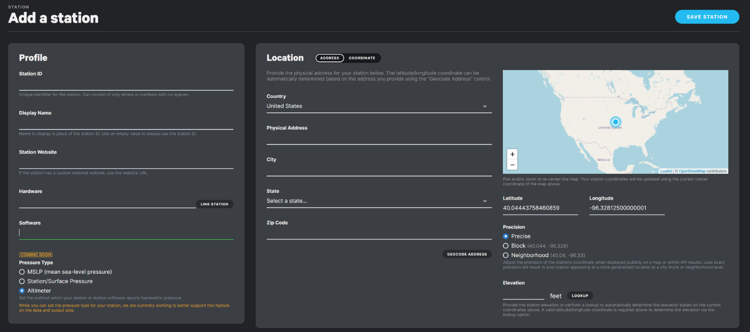 If you're not already signed up, visit PWSweather.com to create an account. After you've validated your email, visit your PWSweather.com dashboard and select "Add a station".