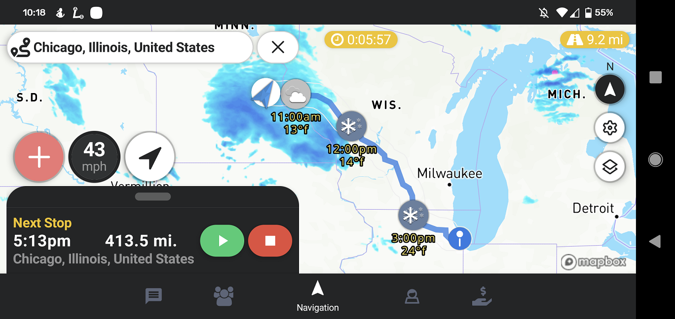 In partnership with the Truck Driver Power team, Xweather built a solution that includes radar, forecasts, and other advanced weather overlays and outputs for drivers using our weather API and Maps. Additionally, using the weather API’s route action, Truck Driver Power’s Navigation Mode displays live views of weather conditions and warnings along the driver’s way, with updates in real-time.