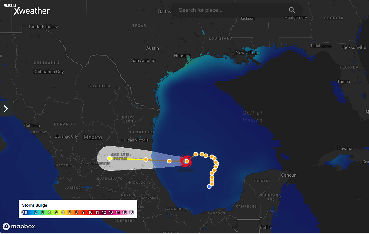 The track of Tropical Storm Alberto in the Gulf of Mexico in June with storm surge impacting Texas and Louisiana, visualized using Xweather MapsGL demos