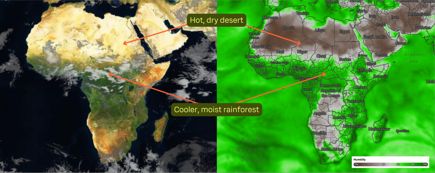 MapsGL visualization demonstrating the difference in conditions between the desert and rainforest regions of Africa