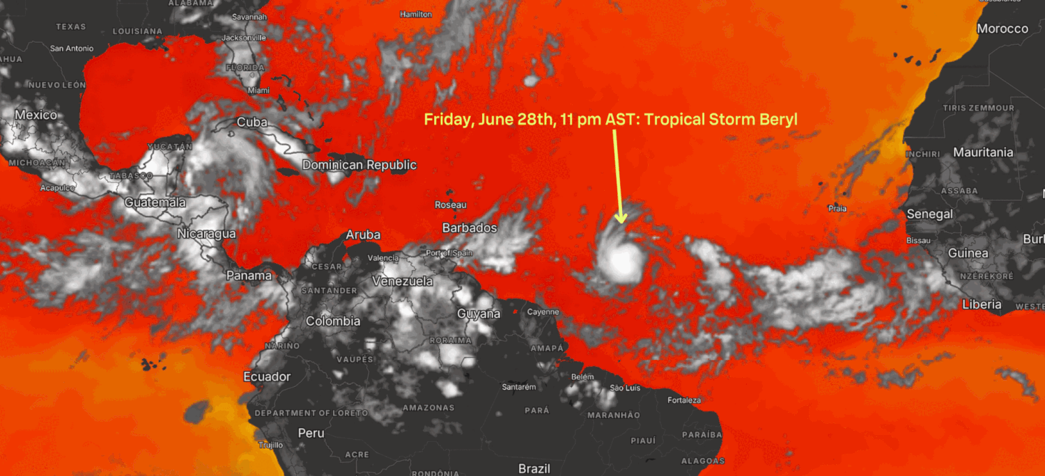 Over the following week this storm rapidly intensified, evolving from a tropical depression into the impressive Category 4 Hurricane Beryl in just 48 hours. By the next Monday evening, Beryl had escalated into a Category 5 storm, the highest rating on the Saffir-Simpson Hurricane Wind Scale. Beryl set a new record as the strongest Atlantic hurricane this early in the season, surpassing the previous record for the earliest Category 5 hurricane held by Hurricane Emily on July 16th, 2005.