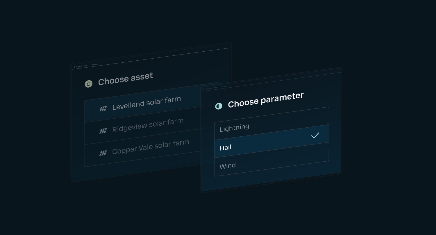 In our example, an energy company creates a hail forecast alert for a solar farm. Assets in Xweather Protect can be defined by points (best for single buildings and small areas), polygons (useful for assets covering a large area, such as solar farms), or lines (ideal for transmission lines and highways).