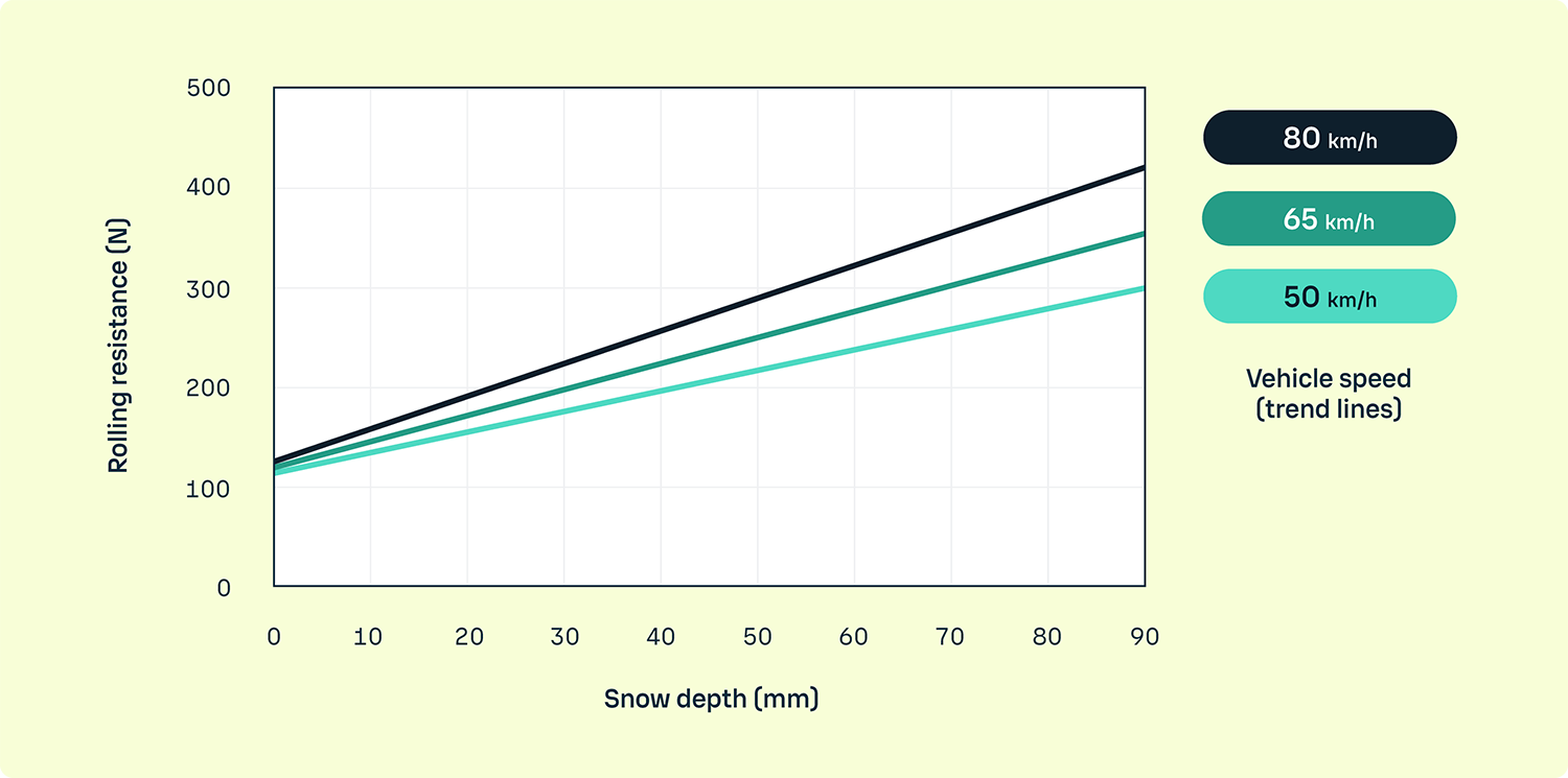 The rolling resistance of tires is mainly affected by water and snow on the road surface. Ambient and road temperatures also influence tire performance. Measurement studies in a report by VTI show that rolling resistance increases linearly with the amount of snow, but this increase heavily depends on snow density.