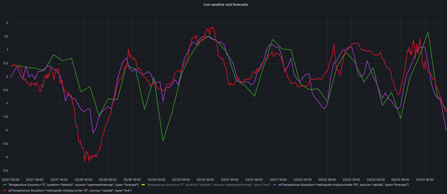 The observed temperature at Metropolia campus (red) and a comparison between an Xcast-powered 6-hour forecast (purple) and a competing forecast (green). The Xcast-powered forecast is consistently closer to the observation than the competing forecast. The graph shows a period between February 27 and March 3, 2024.
