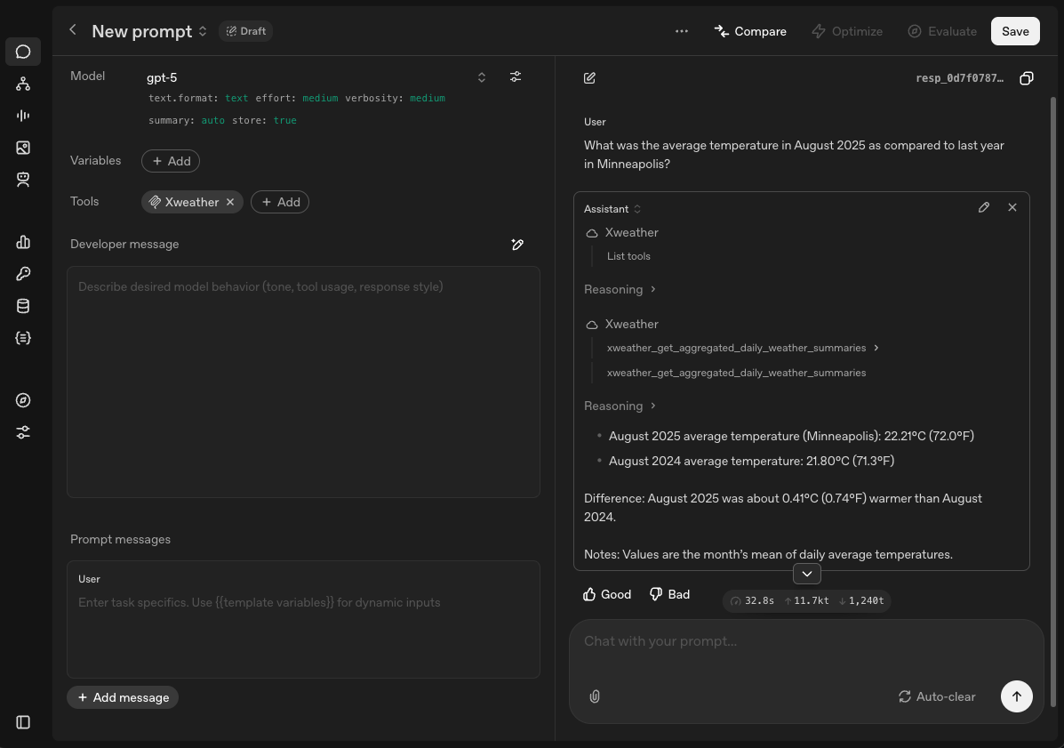 OpenAI’s Responses API and Playground both support MCPs natively. That means your agent can call remote tools, like Xweather’s, just by pointing to our MCP server URL.