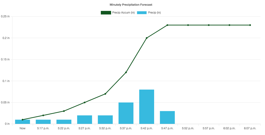 By default, the minutely precipitation forecast is returned in 1-minute intervals for up to 60 minutes, though for our purposes, we will add a 5-minute interval to the filter for a less condensed-looking chart.