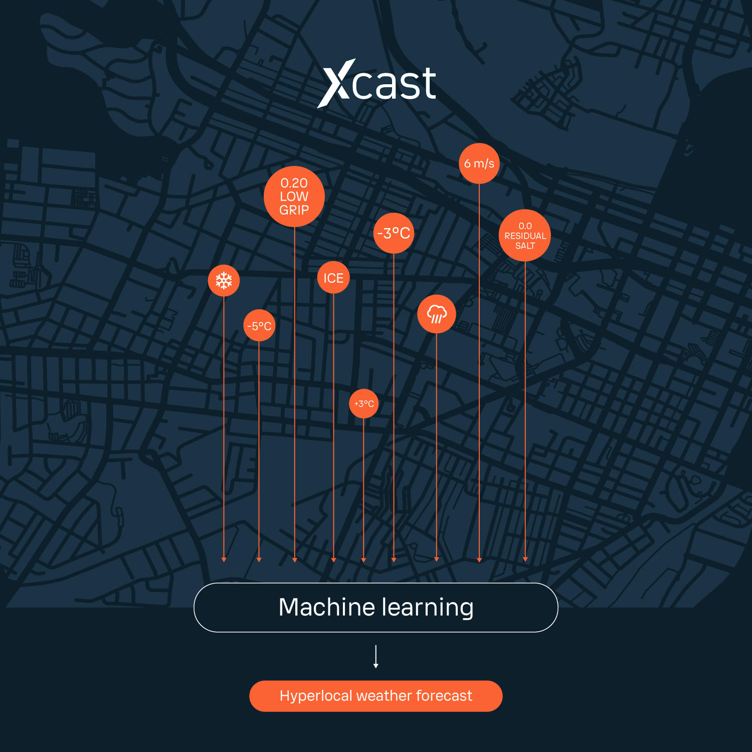 In the context of Xweather Horizon, Xcast is more than just weather forecasting technology; it's a synthesis of high-precision measurements from the sensors installed across your road network and sophisticated forecasting models.