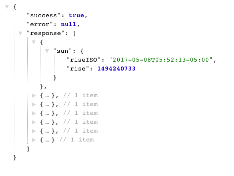 Any information you need about the sun and moon can be accessed via the sunmoon endpoint, with datasets like sunrise/sunset, twilight, moonrise/moonset, and moon phase. In this example, we will grab the sunrise times for the next 7 days using the filter parameter to return just the sunrise time. This example shows two different time formats that are supported (dateTimeISO 8601, and UNIX timestamp):