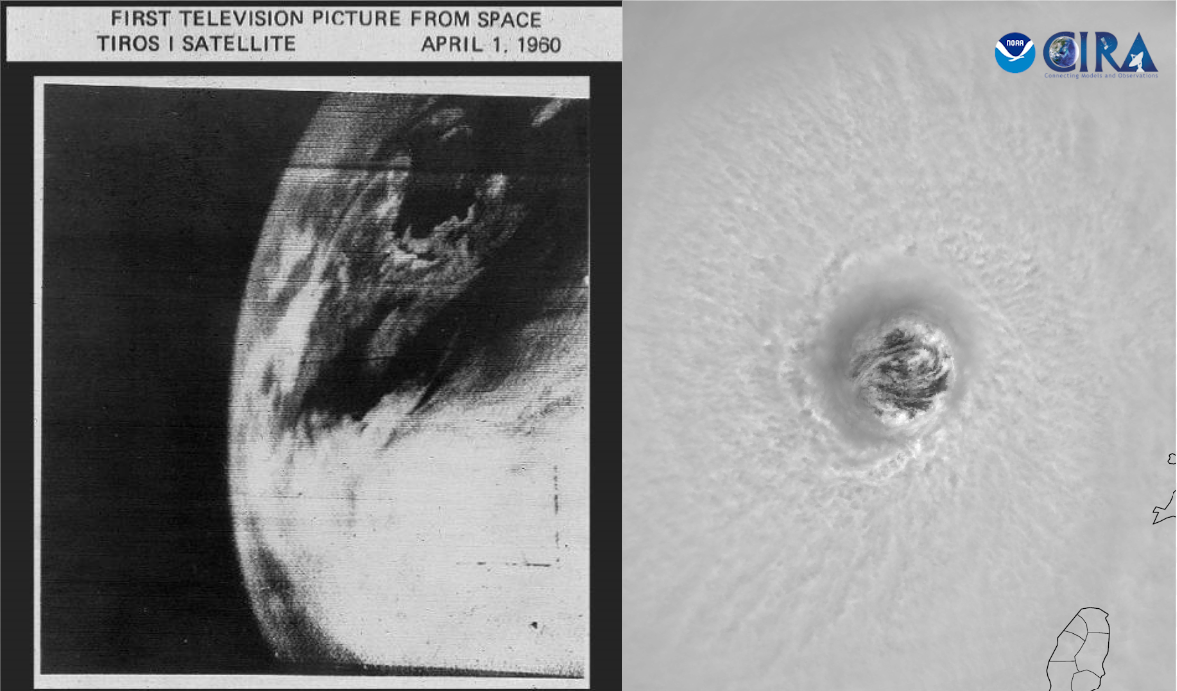 Monitoring technology like our satellites is improving rapidly. Compare the first television picture of earth from space, taken by TIROS-1 in 1960, to recent satellite imagery of Beryl’s eye in the recent satellite images from July 2024. (Credit: TIROS Program, NASA; CSU/CIRA & NOAA.