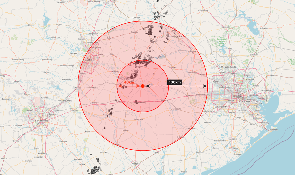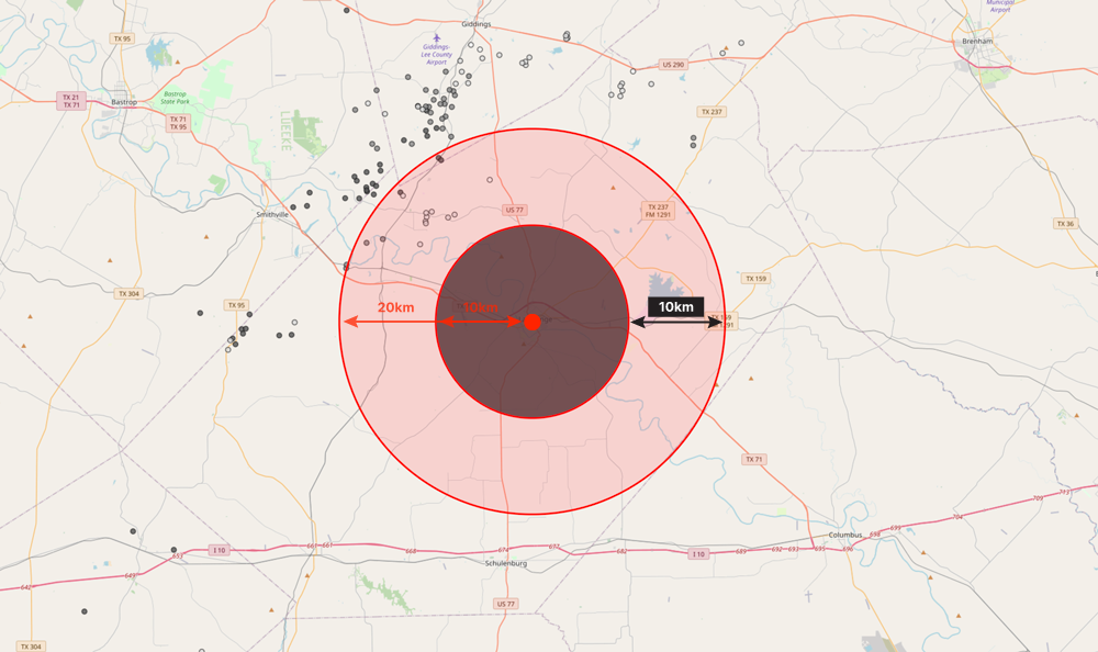 Leverage a minimum radius parameter — minradius — in combination with the radiusparameter to fetch lightning data within a range, such as 50 to 100km from a given point: