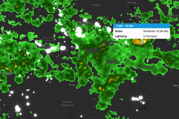 Mapping layers for lightning include options to display lightning within the last 5 or 15 minutes as circles or icons within the raster API. Within MapsGL, custom strike shaders are available for even further clarity in your visuals: